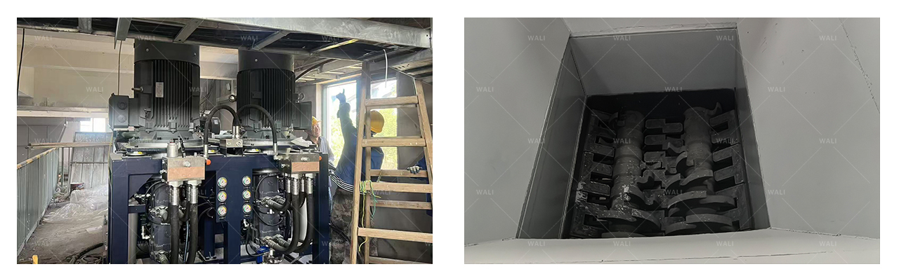 此次项目中,主要的机器是重工双轴剪切式粗破机,每小时处理范围是45-60吨,剪刀式的双轴通过剪切挤压将物料破碎。这种破袋机通常用于处理大型袋装物料如塑料袋、麻袋等包装材料。对回收回来的打包垃圾进行破袋处理,将包裹在袋子内的垃圾分开打撒且不伤害物料本身结构(如瓶子类,金属类等),便于后续分拣设备分选。